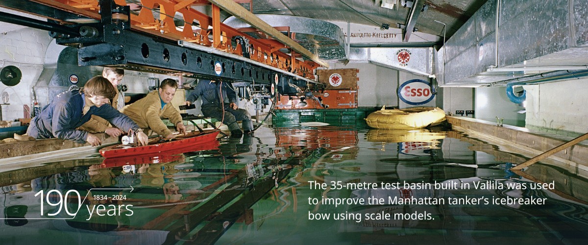 In 1969, a 35-metre ice test basin was built for the project in Helsinki’s Vallila district, funded by the Americans. Based on the designs developed in Vallila, the tanker was subsequently reinforced and extended and its bow was reshaped. The project was a success and SS Manhattan became the first commercial vessel to transit the Northwest Passage.