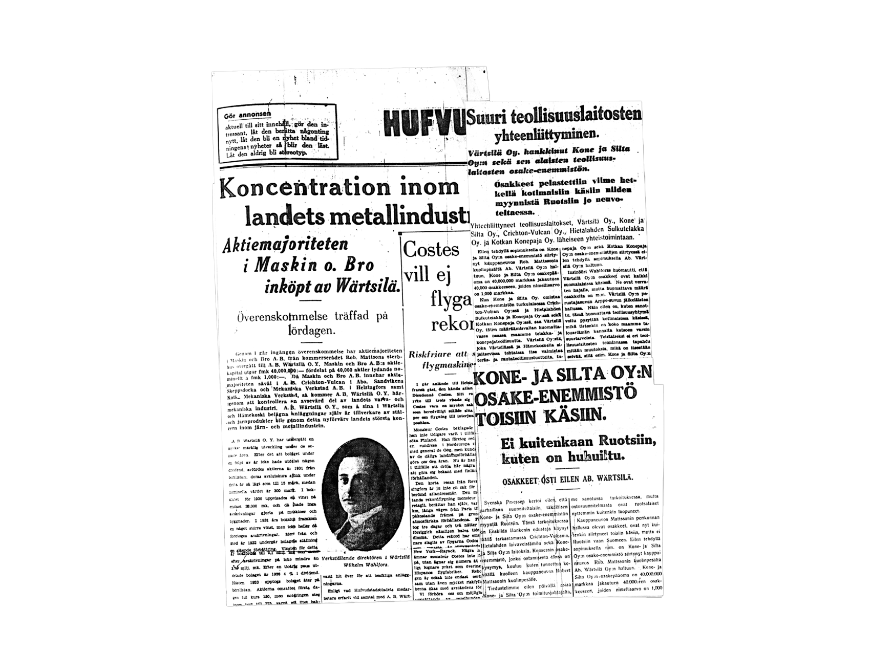 Newspaper articles about Wärtsilä acquiring a majority holding in Kone- ja Siltarakennus Oy in 1935.