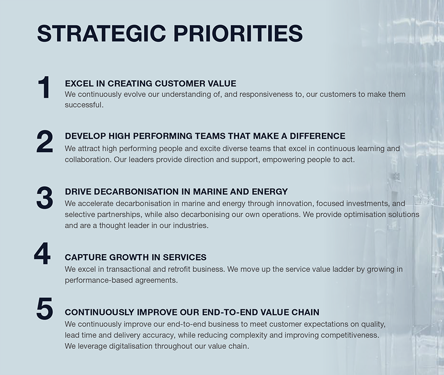 Our strategic priorities define our most important focus areas to reach our target position "Shaping the decarbonisation of marine and energy". The priorities outline the main areas we will work with to get to our target position and clearly formulate our biggest opportunities that have a positive impact on our growth and financial performance.