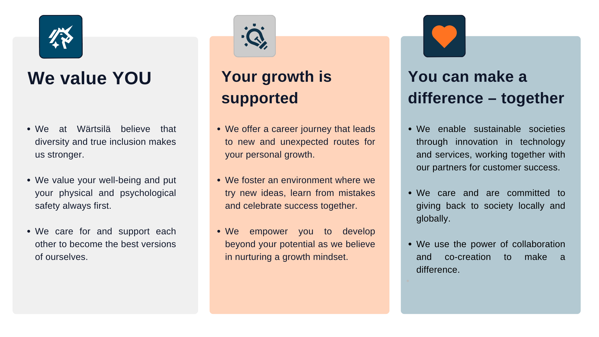 We are a global team of over 18,300 Wärtsilians in 77 countries across all seven continents. We represent 128 different nationalities, and vary also in our fields of expertise; we have roles from underwater divers to cloud and machine learning developers and from assembly line workers to future fuel researchers, quality experts, and beyond. While our skills and backgrounds are diverse, we are glued together by the impact we make and through our purpose: we enable sustainable societies through innovation in technology and services.