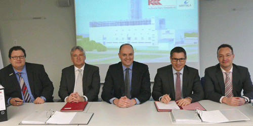 Image 1: Vertragsunterzeichnungszeremonie. Von links nach rechts: Frank Kettig, Business Development Manager, Wärtsilä Energy Solutions; Thomas Becker, Managing Director, Wärtsilä Deutschland; Melle Kruisdijk, Area Vice President, Europe, Wärtsilä Energy Solutions; Dr. Lars Eigenmann, CEO, Kraftwerke Mainz-Wiesbaden AG; Stephan Krome, Board Member, Kraftwerke Mainz-Wiesbaden AG.
