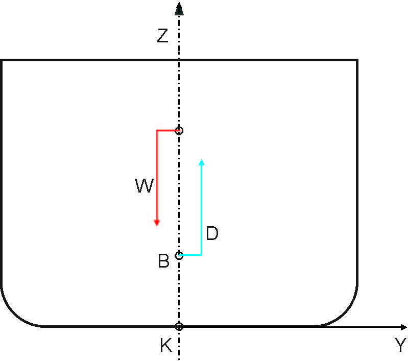 Two vertical forces always act upon the ship when rest in still water: its weight, W, acting downwards through the centre of gravity, G, and the displacement, D, acting upwards through the centre of buoyancy B. The weight and the displacement are equal in magnitude. For the ship in equilibrium the sum of their moments must be zero. Therefore the ship will heel and trim as long as centres of gravity and buoyancy will be in the same vertical line.