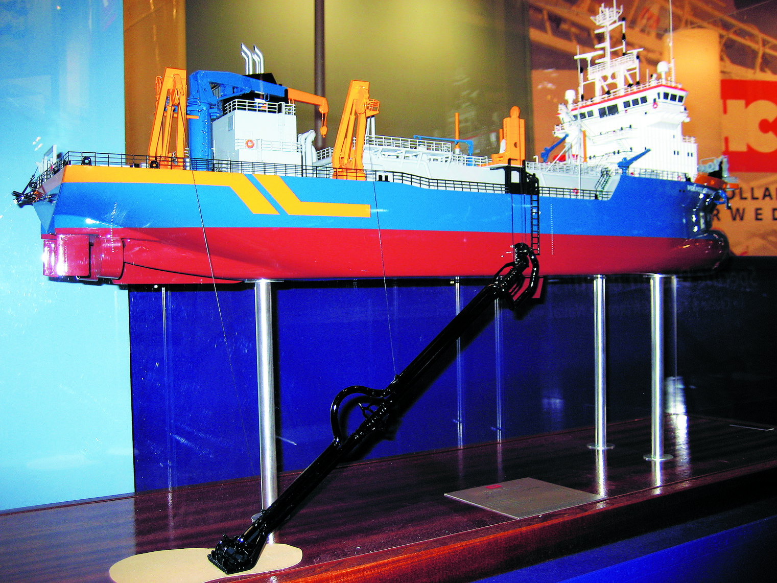 The drag arm is hoisted outboard and lowered to dredging depth with the aid of gantries. When not in use, it is lifted above the main deck level and pulled inboard with the hydraulically powered gantries for storage.