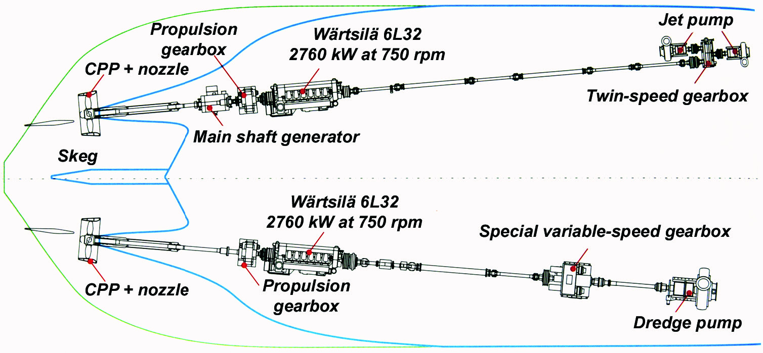The dredger is powered by two Wärtsilä 6L32 engines, each of 2760kW MCR output at 750rpm. Each engine drives through reduction gearbox 2500mm diameter CP propeller running at 230 rpm in the nozzle. The maximum power available for propulsion is 2000kW per propeller. The single dredge pump is driven directly off the forward end of the starboard main engine through a clutch coupling, a long shaft and a two-stage variable-speed gearbox. An equivalent arrangement is employed for the twin jet pumps on the port side.