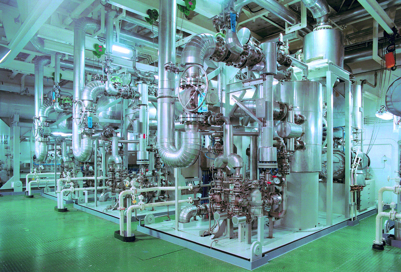 The principle of operation of the reliquefaction plant onboard a Very Large Gas Carrier (VLGC) is as described above. The cargo tanks act as evaporators and the cargo as refrigerant and the seawater is the coolant for the condenser. The reliquefaction unit is built up around the cargo compressor; where the compressor is used to compress cargo boil off vapour to sufficient pressure to be liquefied against normally seawater. Reciprocating compressors with labyrinth seals of make Burckhardt Compression is the definite market leader. The compressor can have either two or three stages of compression. The traditional solution for a VLGC is to have four identical reliquefaction units installed. During loading all units are normally running in order to handle the displaced vapour and vapour generated due to heat input and flashing. These large gas carriers are designed to load two different types (grade) of cargos having physical segregation both in the liquid phase and vapour phase. When the vessel is loading two grades of cargo, at least one reliquefaction unit is dedicated to the less volatile cargo, normally Butane.