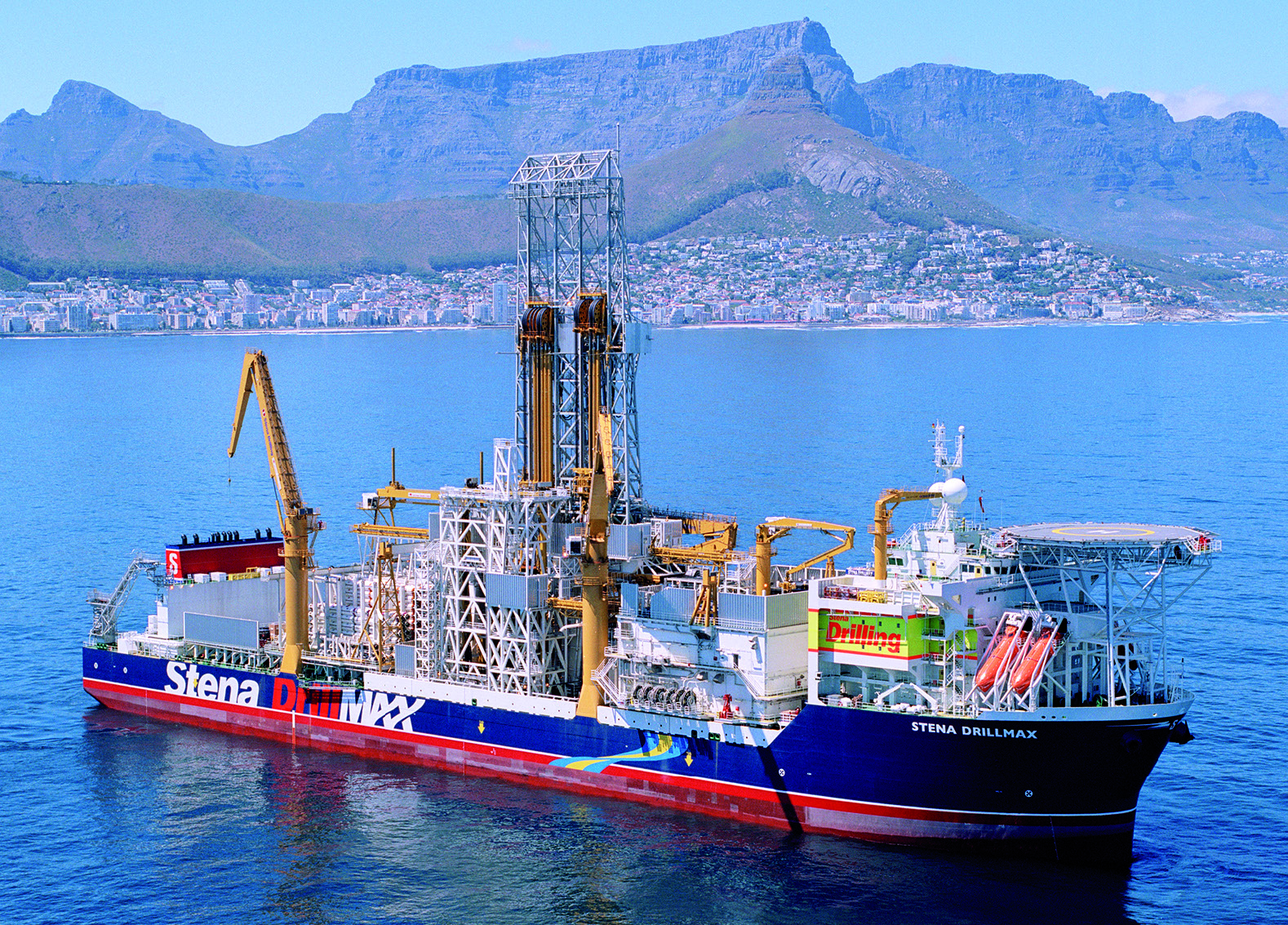 The world’s largest drilling ship STENA DRILLMAX, built by Samsung Heavy Industries in Korea has twin drilling derricks and is intended for oil and gas exploration in water up to 3000m. With a displacement of 97,000t, overall length of 228m and breadth of 42m, it is capable of drilling to a depth of 11,000m.