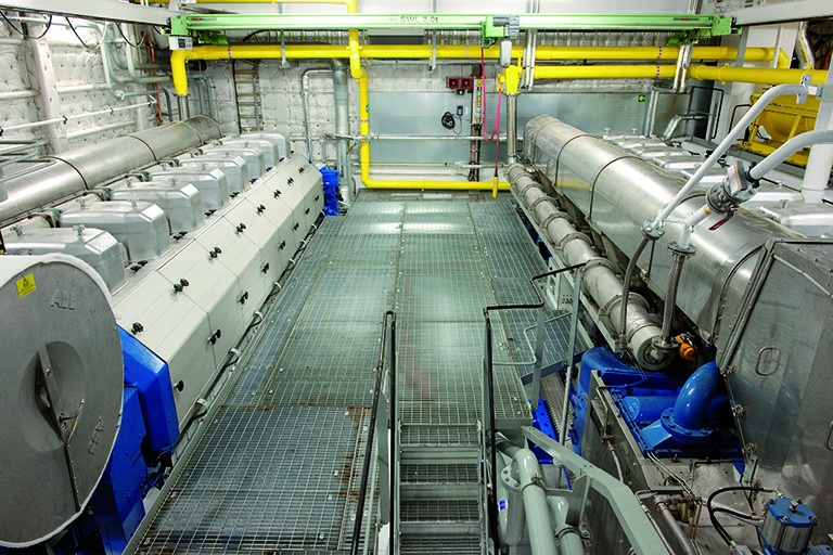 The dual-fuel electric propulsion is based on Wärtsilä 50DF-type machinery. Four eightcylinder 50DF engines drive ABB alternators delivering power to the main switchboards for two 10,500kW ABB propulsion motors and other shipboard consumers. With two independent engine rooms and two drive lines the propulsion system offers a high degree of redundancy.