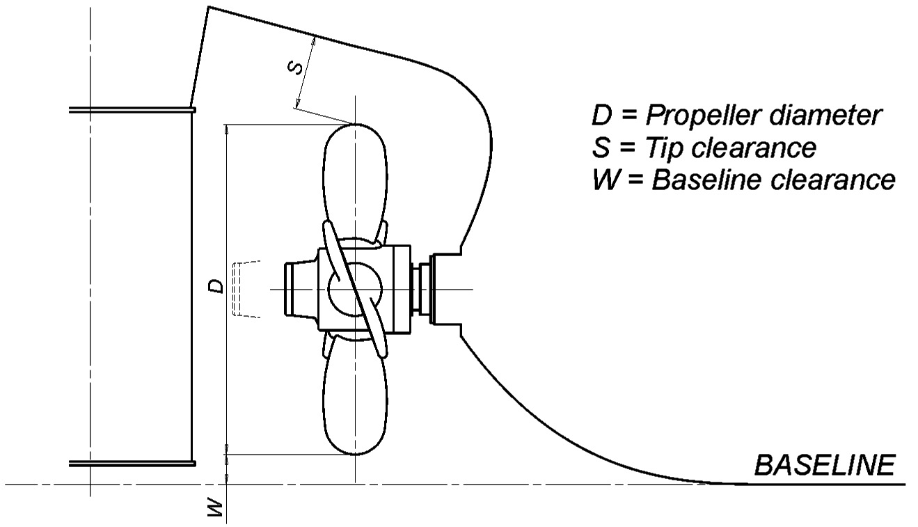Base line clearance minimum is 50-100mm. In twin-screw ships the blade tip may protrude below the base line.