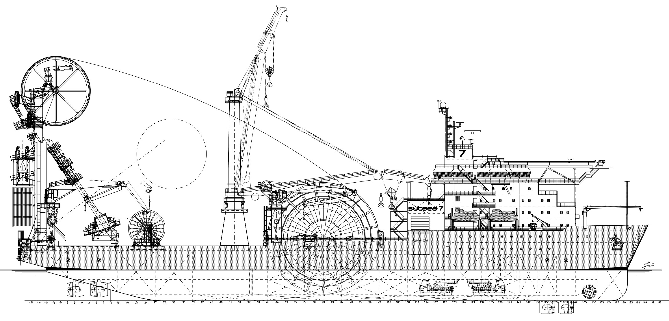 Built at the Merwede Shipyard in Netherlands, the SEVEN OCEANS is intended for installation of rigid pipes up to a diameter of 16’’ on the ocean floor in depths up to 3000m using the reel-lay method. It is the fastest method for installing oil pipelines on the seabed: because the lengths of pipeline are already welded together on shore, the vessel can continue to sail while the pipelaying is in progress. With an installing speed of 35 metres per minute, 100 kilometres of steel can installed on the seabed in just two days. The ship can deploy two remote operated vehicles which can monitor the pipelaying activities. Besides pure pipelaying, the ship can be used for subsea construction, ROV support and survey activities.