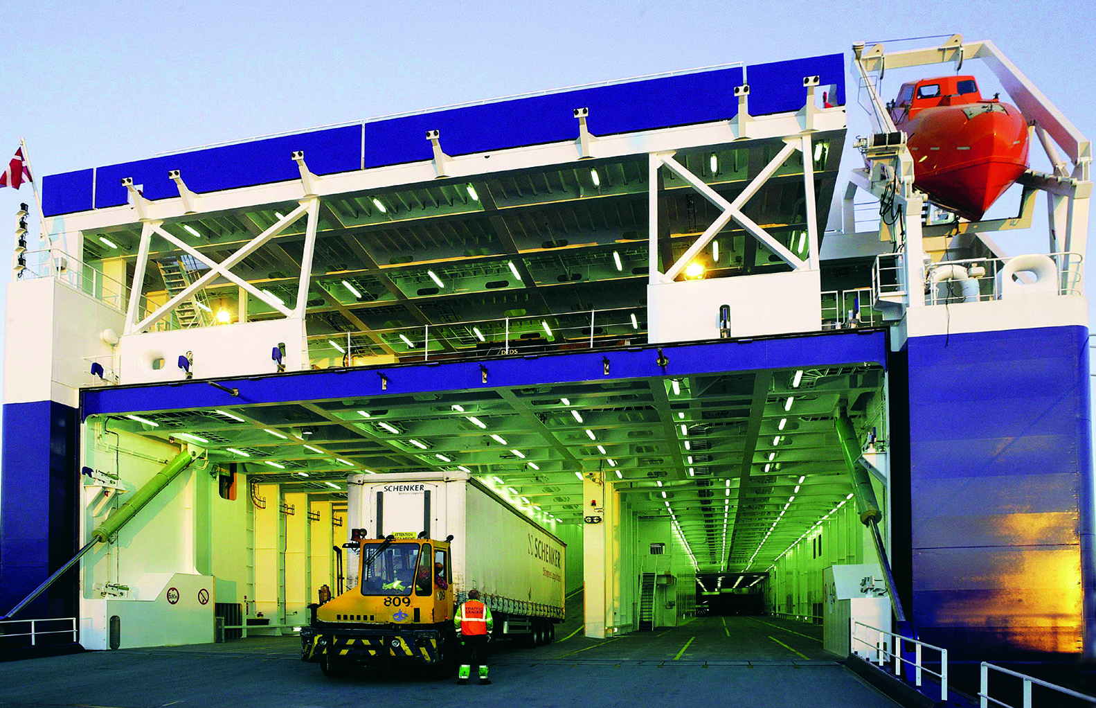 256 x 14m-long trailers can be stowed on the four fixed decks with a total capacity of 3831 lane-metres. In addition, two hoistable decks are fitted forward the engine casing providing 2660 lane-metres for 300 cars. All the vehicle decks are fitted with SAT lashing pots that secure trailer trestles.