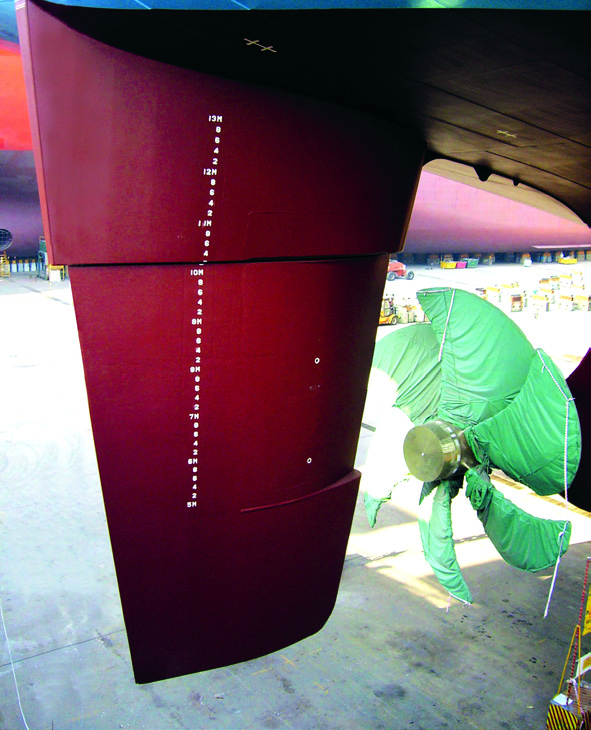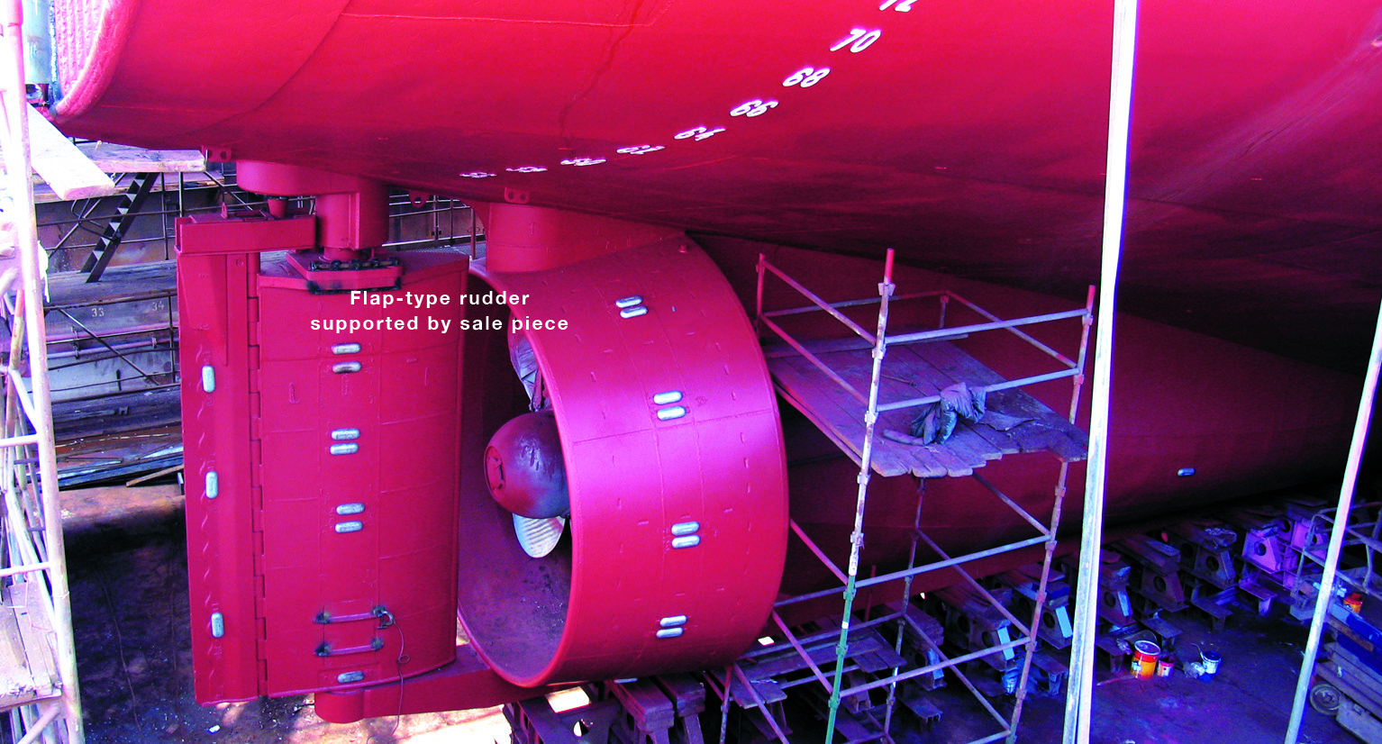 - Twisted leading edge rudder – In contrast to conventional symmetrical rudders, the twisted rudder comprises a special asymmetrical section offset to port and starboard at the leading edge along the rudder span. This feature results in improved pressure distribution on the rudder surface from the rotational propeller flow, thereby improving resistance, manoeuvrability and cavitation qualities.