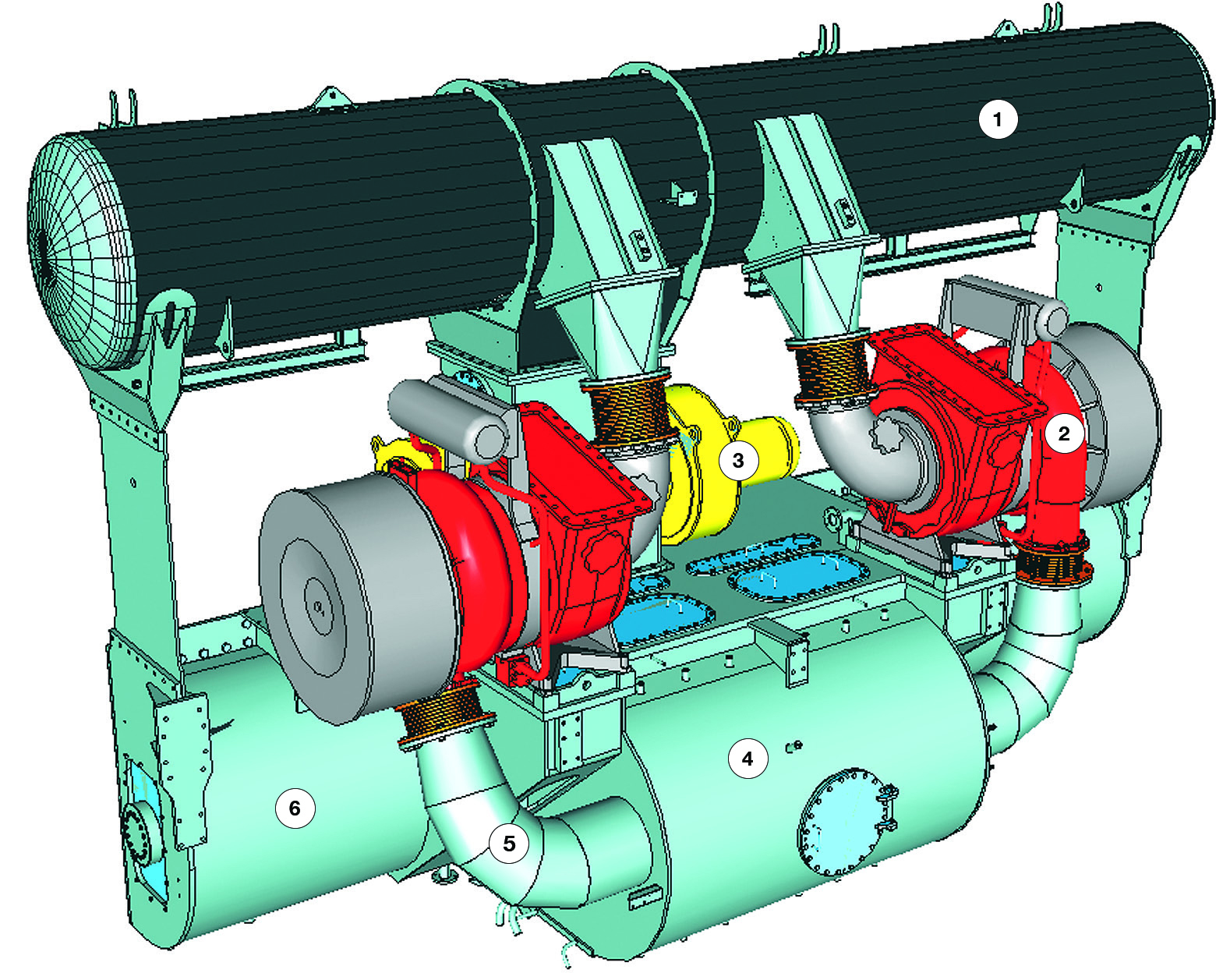 Exhaust gas driven turbochargers are used to supply pressurised fresh air for scavenging and supercharging. In two-stroke diesels, an electrically driven auxiliary blower is usually provided because the exhaust gas driven turbocharger cannot provide enough air at low engine speed, and pressurised air is usually cooled to increase the charge air density.