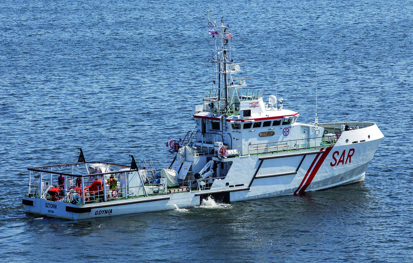 Even under extremely heavy seas, the vessel can maintain a speed of up to 25 knots. The equipment on board includes a powerful towing winch and a towing hook plus a 20-tonne deck crane. In the stern of the hull, there is a 9.5m 18-knot daughter boat built by Luerssen. This daughter boat is located in a slipway, which is unfolded when the hinged stern is lowered. Rescue zones have been established on each side of the vessel. A small Avon RIB is also installed.