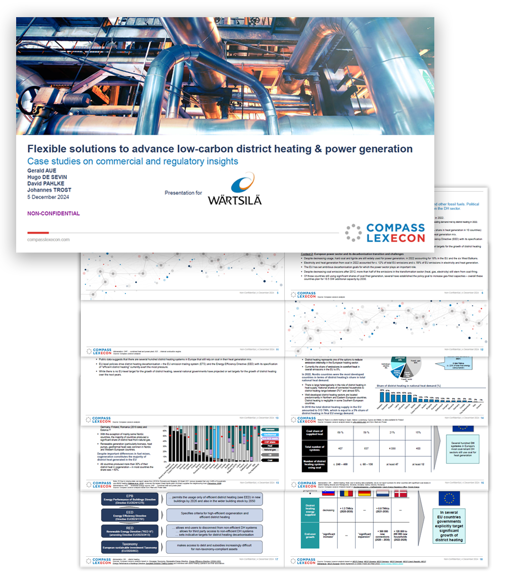 This report showcases ways to decarbonise fossil (particularly coal) based district heating systems in a commercially viable way and the role flexible generation technologies (particularly gas-engines) could play in this transition, while identifying roadblocks to decarbonisation in the fields of market structure, regulation, capabilities and market trends.