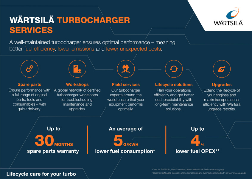 As an engine manufacturer Wärtsilä has extensive experience and expertise in turbocharging technology and is the only true global service provider in the market licensed to service ABB, Napier and KBB turbochargers.