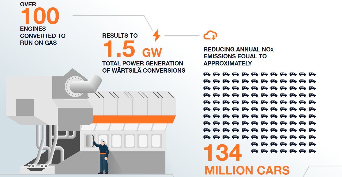 Wärtsilä has an extensive track record of optimisations and conversions to new fuels for existing assets – over 100 engines worldwide are converted from HFO to run on gas. The main drivers for conversions from liquid fuels to gas have been the reduction of operational costs, local and GHG emissions. Local NOx emissions are reduced by 80-90%, and as natural gas contains almost no sulphur or ash, SOx and PM emissions are very low. The GHG emissions are reduced by 10-15%. By converting from HFO to natural gas, power producers can become more competitive and meet new emissions regulations – ensuring that they can continue to operate and get a return on their investment despite a changing business environment.