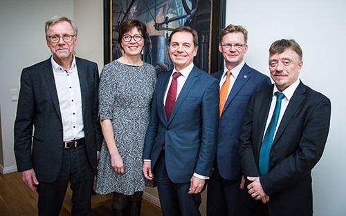 Vasemmalta: Åbo Akademin rehtori Mikko Hupa, Aalto-yliopiston vararehtori Tuija Pulkkinen, Wärtsilän yhteiskuntasuhteiden ja lakiasioiden johtaja Kari Hietanen, Vaasan yliopiston rehtori Jari Kuusisto ja Tampereen teknillisen yliopiston dekaani Pauli Kuosmanen