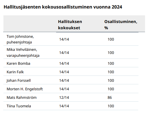 Wärtsilän hallitus kokoontui 14 kertaa vuonna 2024, ja jäsenten osallistumisprosentti oli 98. Hallitus käsitteli kokouksissa monia erilaisia aiheita. Painopisteenä oli Wärtsilän strategia, mukaan lukien liiketoimintastrategiat, energiavarastointiliiketoiminnan strateginen tarkastelu ja kestävän kehityksen strategia. Hallitus seurasi myös tiiviisti yhtiön taloudellista suorituskykyä. Lisäksi hallituksen kokouksissa käsiteltiin ja seurattiin ulkoisia kehityssuuntauksia, mukaan lukien geopolitiikan, sääntelyn, teknologian ja markkinoiden kehitys. Merkittävä osa vuoden 2024 agendaa oli nykyisten kestävyystavoitteiden, esimerkiksi Set for 30 -ohjelman, edistymisen arviointi sekä uusien kestävyystavoitteiden asettaminen. Myös yritysten kestävyysraportointia koskevan direktiivin (CSRD) vaatimusten täyttämiseen kiinnitettiin paljon huomiota. Muita prioriteetteja olivat organisaatioon liittyvät asiat, kuten Wärtsilän toimintaperiaatteet, ihmisiin liittyvät prosessit ja palkitsemisperiaatteet.