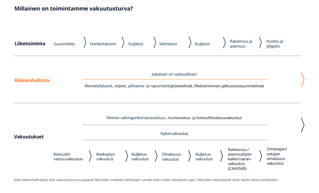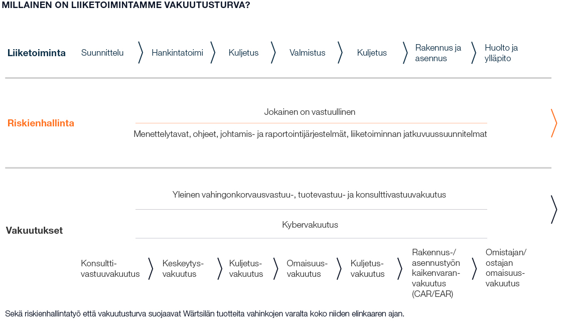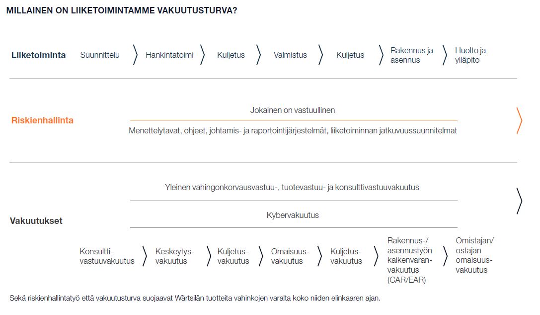 Tavoitteena on, että henkilöstöön, omaisuuteen, toiminnan keskeytymiseen, mukaan lukien alihankkijoista johtuva toiminnan keskeytyminen, sekä toiminta- ja tuotevastuisiin liittyvät vahinkoriskit on katettu asianmukaisin vakuutuksin. Wärtsilällä on oma jälleenvakuutusyhtiö Vulcan Insurance PCC Ltd Wärtsilän omien riskien vakuuttamiseen. Yhtiö sijaitsee jälleenvakuutustarkoitusta varten Guernseyn saarella. Vulcan Insurance PCC Ltd:n tulos konsolidoidaan konsernin kirjanpitoon, ja yhtiö maksaa veronsa normaalisti Suomeen.