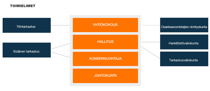 Wärtsilän käyttämän yksitasoisen hallintomallin mukaan konsernin johtamisesta vastaavat yhtiökokous, hallitus ja toimitusjohtaja, joiden tehtävät määräytyvät pääosin Suomen osakeyhtiölain mukaisesti. Yhtiökokous valitsee hallituksen ja tilintarkastajan. Hallitus vastaa yhtiön strategisesta johtamisesta, ja sen työtä tukevat hallituksen valiokunnat. Hallitus nimittää toimitusjohtajan, joka vastaa yhtiön päivittäisestä operatiivisesta johtamisesta johtokunnan tuella.