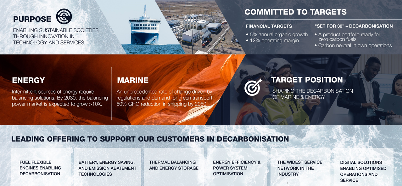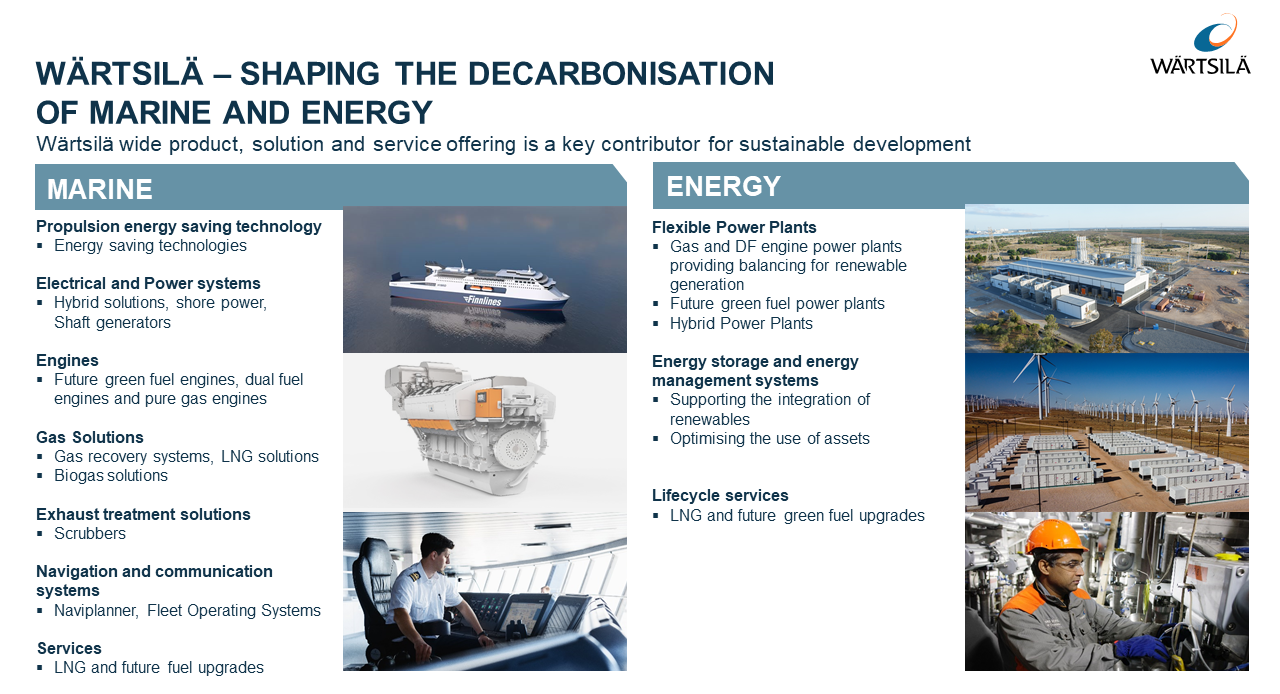 Konsernijohtajamme Håkan Agnevall aloitti tilaisuuden kertomalla Wärtsilän strategiasta, joka keskittyy vahvasti hiilineutraaliuuteen. Wärtsilän tavoiteasema on kulkea kohti hiilineutraalia merenkulku- ja energia-alaa. Energiamarkkinat ovat siirtymässä kohti 100% uusiutuvan energian tulevaisuutta, merenkulkumarkkinoille tulee uusia säännöksiä ja ympäristöystävällisien merikuljetusten kysyntä kasvaa jatkuvasti. Wärtsilän markkinoiden johtava tuotetarjooma tukee asiakkaidemme siirtymää kohti hiilineutraaliutta.