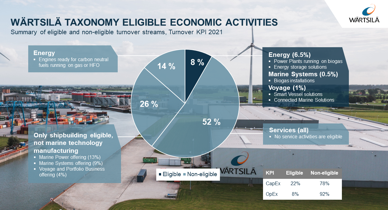 Wärtsilä on analysoinut taksonomiakelpoisia taloudellisia toimintojaan vuodelta 2021. 8% vuoden 2021 liikevaihdosta oli taksonomiakelpoista, johon lukeutuivat energian varastointiliiketoiminta, biokaasuratkaisut ja digitaaliset laivaliikenteen optimointiratkaisut. 22% investoinneista ja 8% operatiivisista kuluista olivat taksonomiakelpoisia.