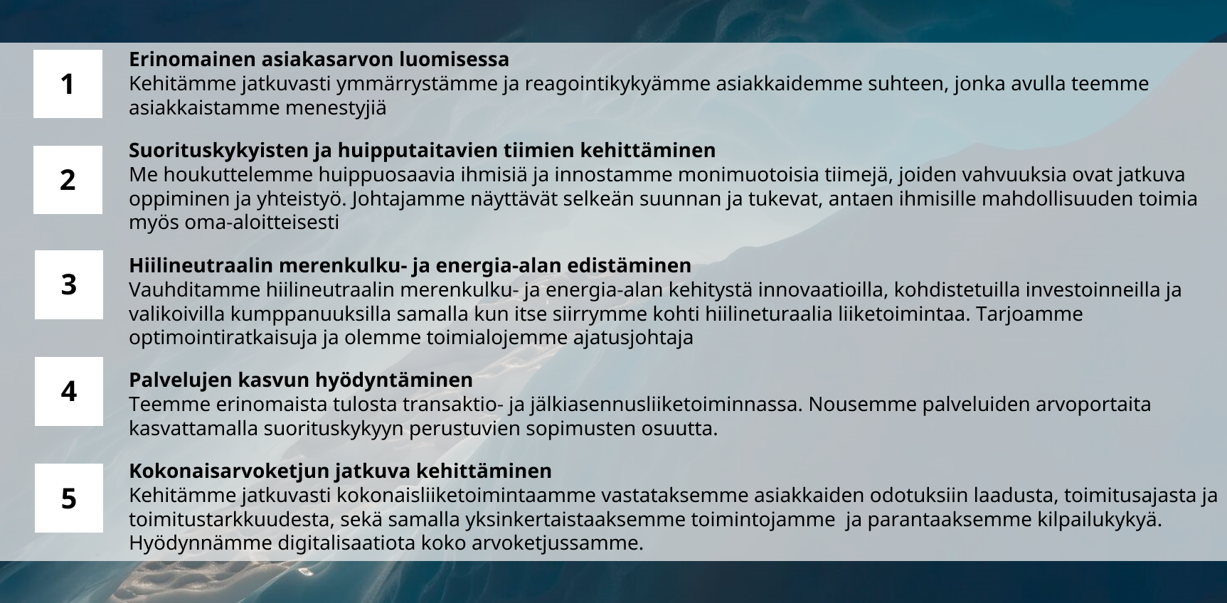 Wärtsilällä on hyvät edellytykset hyödyntää markkinoiden elpymistä ja kasvua. Orgaanista kasvua edistävät hiilineutraaliuden tarjoamat mahdollisuudet ja palvelut. Orgaanista kasvua täydentävät mahdolliset kumppanuudet ja synergiaetuja tarjoavat pienten yritysten hankinnat. Nykyinen asennettu laitekanta antaa vankan pohjan palveluliiketoiminnan kasvulle. Suorituskykyyn perustuvissa sopimuksissa on merkittävää kasvupotentiaalia sekä merenkulku- että energialiiketoiminnassa. Tätä tukee vahva tarjoomamme sekä ei-sopimuspohjaisissa palveluissa että suorituskykyyn perustuvissa sopimuksissa. Samalla vihreä siirtymä tarjoaa merkittäviä mahdollisuuksia jälkiasennuksiin ja konversioihin. Keskitymme ensiluokkaiseen suorituskykyyn ja vahvaan toteutukseen, joka perustuu liiketoimintojemme läpinäkyvyyteen ja vastuuseen. Kaikilla liiketoiminnoillamme on selkeä tulosvastuu, joten päätökset tehdään siellä, missä asiakasarvokin tuotetaan. Jotta kestävällä arvon luomisella olisi pitkäjänteinen perusta, pyrimme rakentamaan suorituskykyisiä, jatkuvaan parantamiseen tähtääviä tiimejä. Uskomme, että näin saamme Wärtsilään parhaat osaajat ja saamme heidät sitoutumaan pitkäaikaisesti. Välitämme ihmisistä ja kehitämme heidän osaamistaan. Strategian toteutusta tukevat vahva taseemme ja rahoitusrakenteemme. Wärtsilällä on selvät taloudelliset tavoitteet ja vankka sitoumus niiden saavuttamiseen. Selvät pääoman käyttöperiaatteet ja aktiivinen tarjooman hallinta antavat hyvät edellytykset pitkäjänteiseen omistaja-arvon luomiseen.