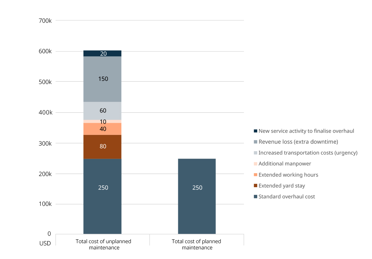Figure 2: Example cost comparison of unplanned vs. planned turbocharger maintenance