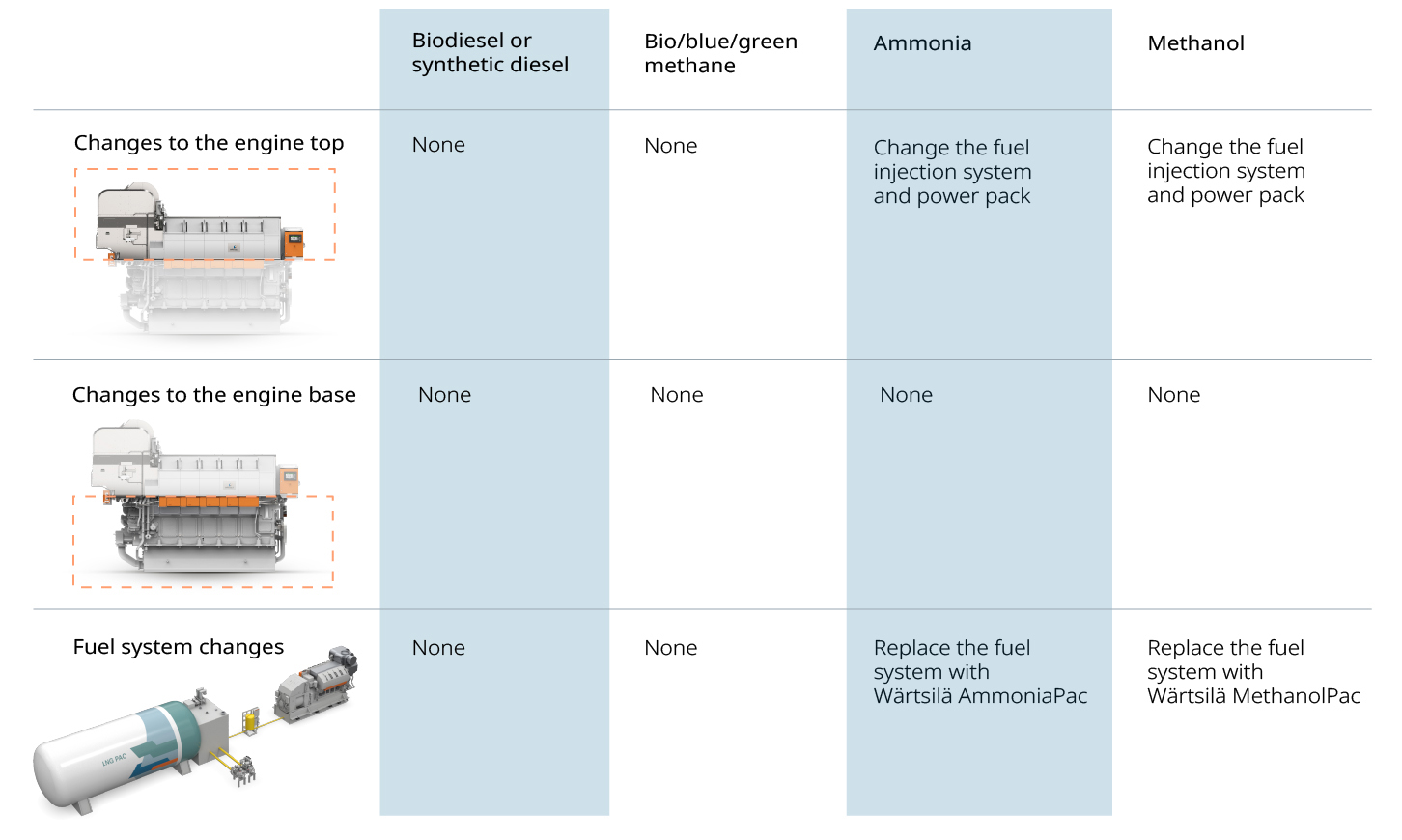 Figure 1. The changes needed to convert an LNG-capable Wärtsilä dual-fuel engine to run on alternative fuels.