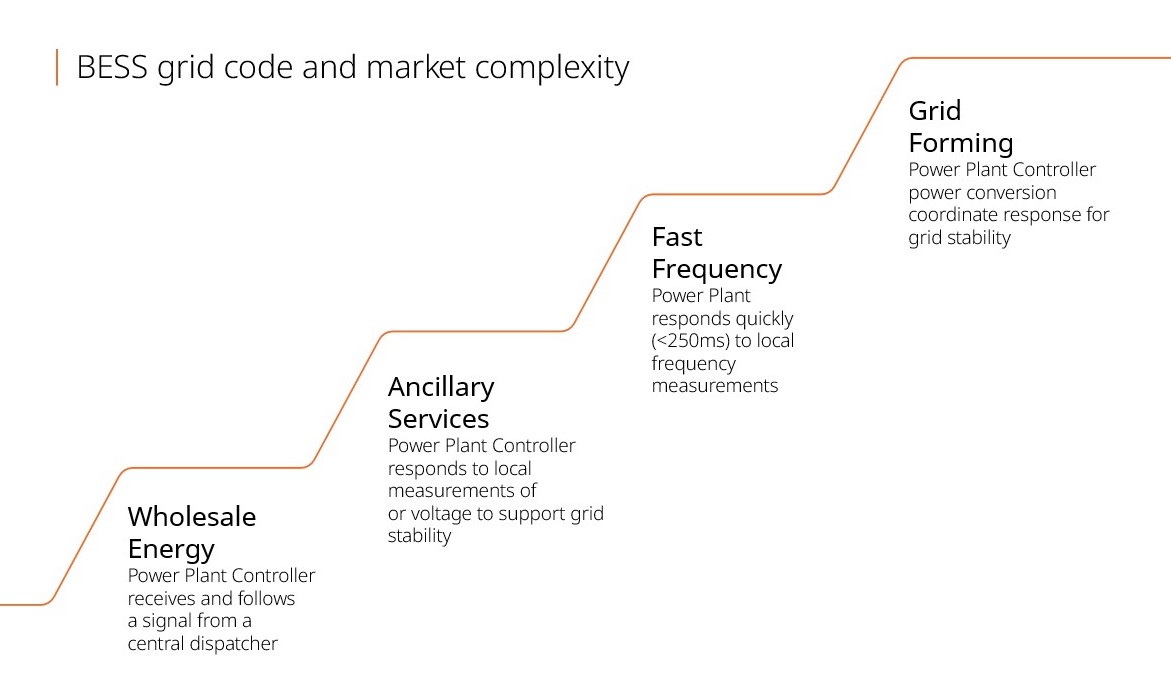 The increase of renewable energy penetration in global markets over the last few years is driving significant changes in grid codes and market requirements. Wholesale energy markets have the lowest level of complexity, in which the PPC follows a signal from a central dispatch without much extra processing. The next level of complexity is ancillary services, such as frequency or voltage support, which require the PPC to react to a local measurement of grid conditions. The next step up from that is fast frequency response, in which the PPC responds to local frequency measurements in less than 250 milliseconds. The highest level of complexity is grid-forming, which includes virtual inertia and short circuit contribution, where the PPC and power conversion system (PCS) coordinate to ensure grid stability.