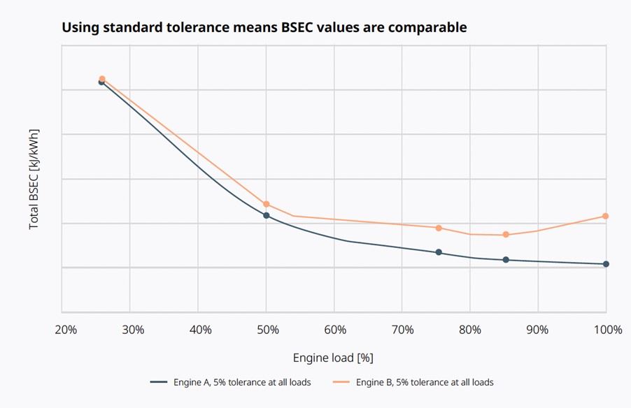 In this case, engine B looks like the better choice for a vessel that operates at low loads. But if you look at the fine print, you’ll notice that engine B uses different tolerances from 5 to 9% across the range of loads, flattering the engine results and making it hard to know how the performance really compares with other engines.