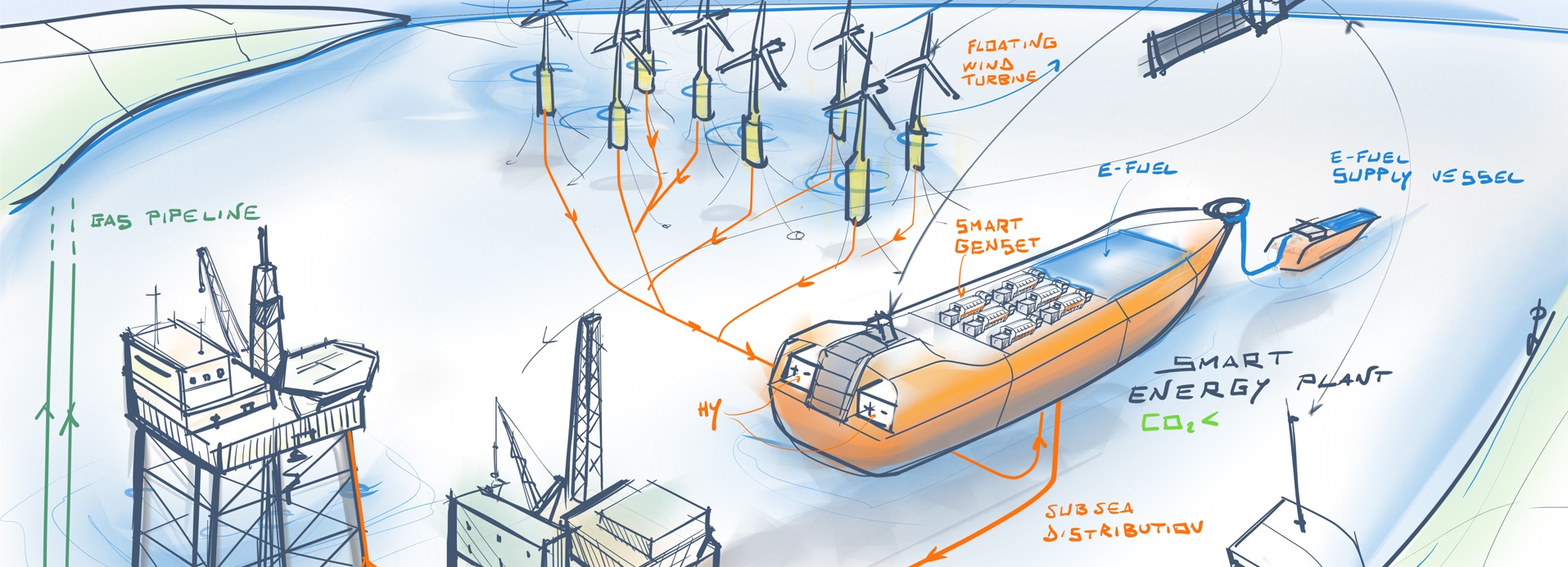 “Currently offshore power demands are met with gas turbines or diesel generators, both of which contribute to the production of CO2 emissions,” points out Tim. “One promising solution could be to identify a cluster of offshore fixed assets that are in close proximity, then deploy a number of floating wind turbines to generate enough baseload to satisfy their energy demands. This power would be routed to a repurposed floating production storage and offloading (FPSO) vessel or similar stable floating structure and then redistributed to the installations as required. Wind power will generate the baseload while our flexible 4-stroke power generating sets – adapted to run on the various future fuels under consideration – will provide the necessary flexibility, resilience and reliability for stable energy generation. Hybrid batteries can be used to allow a fast ramp up, perhaps supplemented with an energy storage system. This combination of technology turns the vessel into a floating energy hub, ready to meet all the power needs of the surrounding installations.”