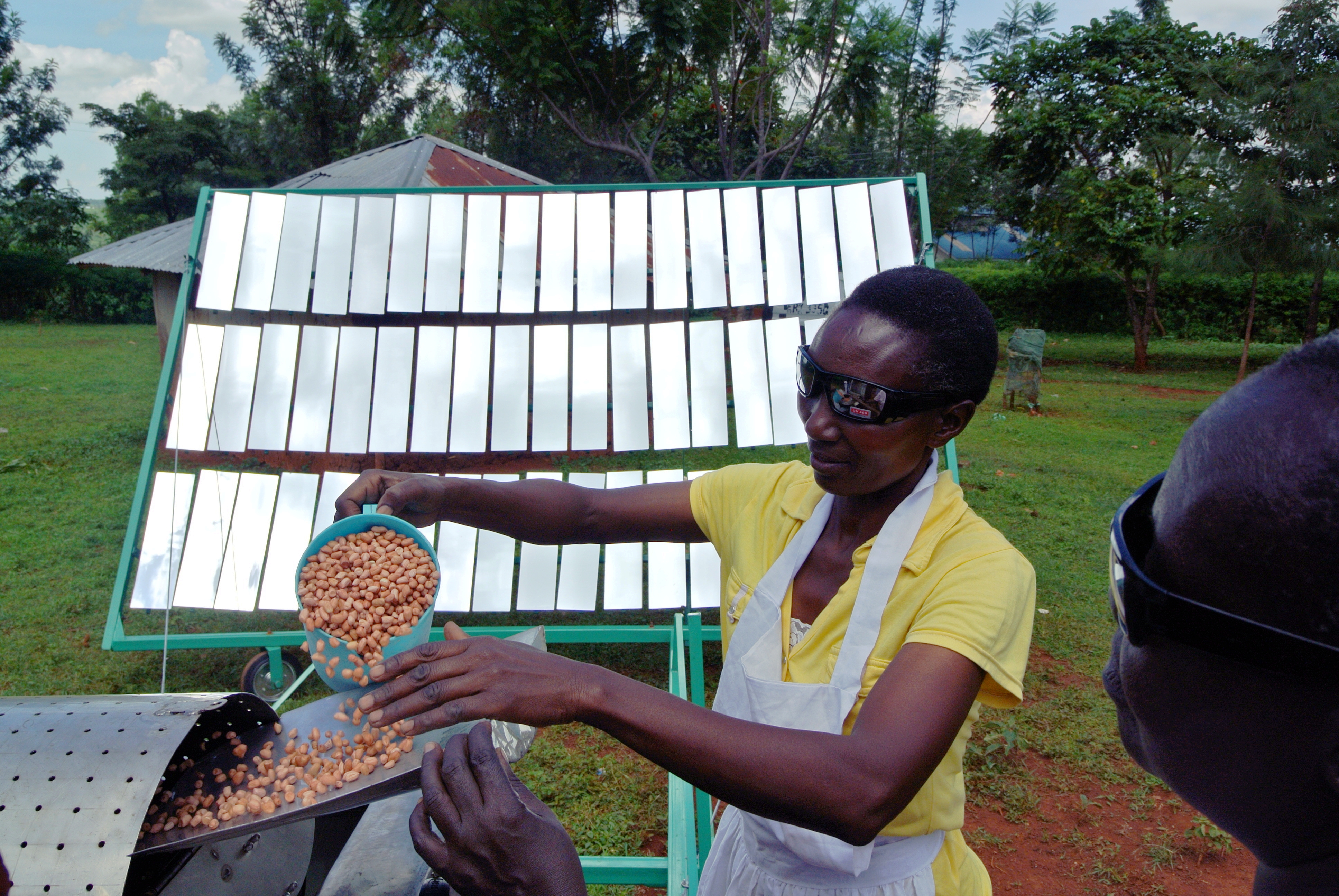 Pouring the peanuts into the solar roaster
