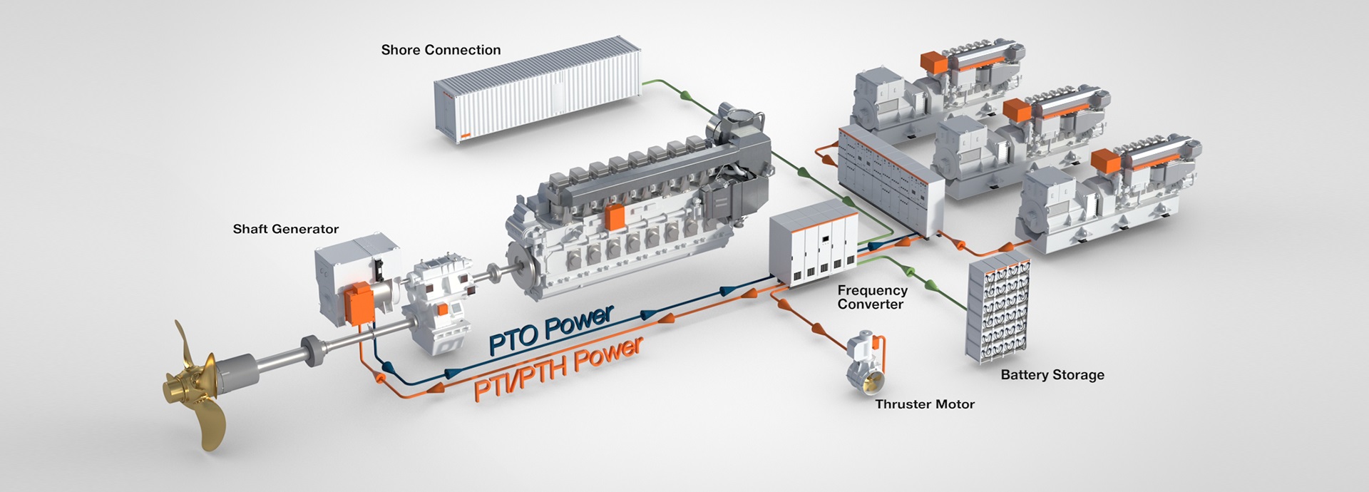 A shaft generator uses the main engine and propeller shaft’s rotational motion to generate electricity, with a frequency converter supplying three-phase current at a constant voltage to engines and thrusters, and to cover the hotel load.