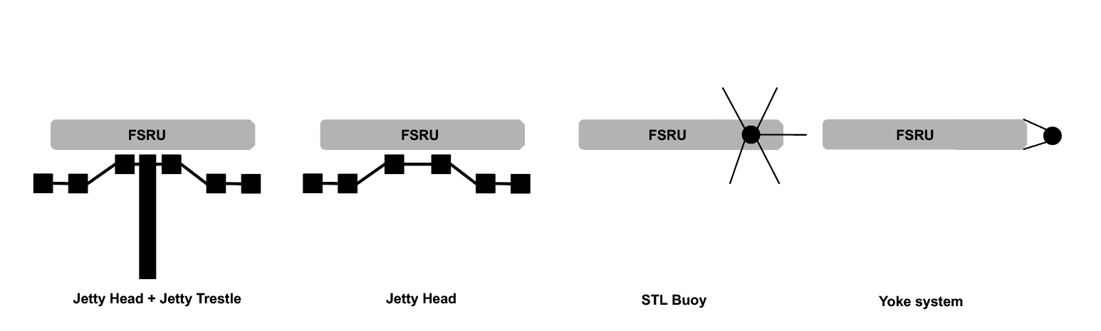 The most common concept for FSRUs is mooring at shore (> 60% have jetty + access trestle). This is the conventional FSRU and commonly referred to when comparing with land-based terminals. There are also concepts that use other kinds of mooring technology. These are, generally, more expensive systems that are used where conventional jetty structures are impractical to construct or are not permitted.