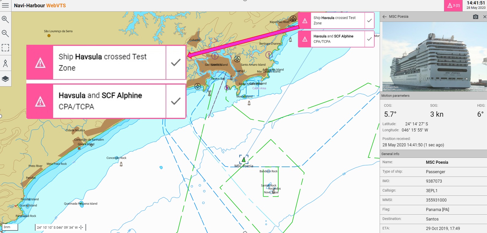 The 1st image shows how these alarms are displayed on the operator screen. The vessels stay close to São Lourenço da Serra, a suburban municipality of São Paulo in Brazil. The first alarm warns that the vessel