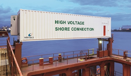 A shore connection, also known as cold ironing, is when a ship is in port with all its engines shut down and is receiving its electrical power requirements from the local onshore grid. Wärtsilä’s containerised SAMCon shore connection provides
