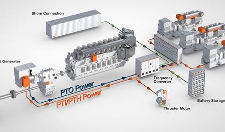 Wärtsilä hybrid propulsion system with shaft generator plus complete control system to optimise fuel consumption, manage thrusters and control battery charging and discharging.