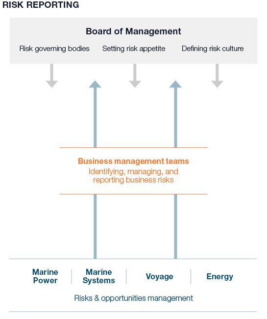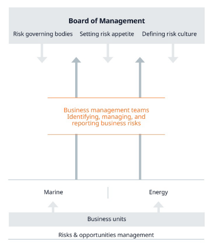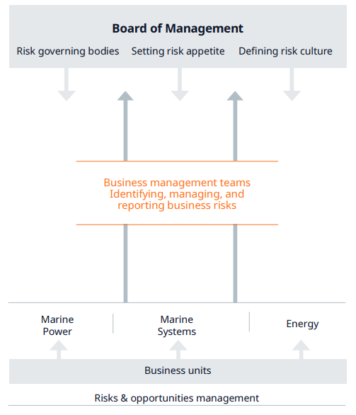 Wärtsilä's businesses are tasked with adhering to their strategies and achieving their operational and financial targets. Additionally, the businesses and their management teams are responsible for implementing ongoing risk management actions to identify, manage, and address all significant risks. This responsibility extends to the business unit level and beyond within the business organisation. Each business regularly presents its risk profile to the President & CEO, the Chief Financial Officer, and the rest of the Board of Management.