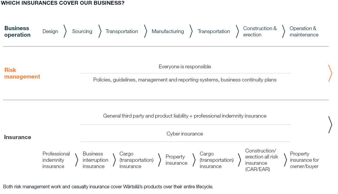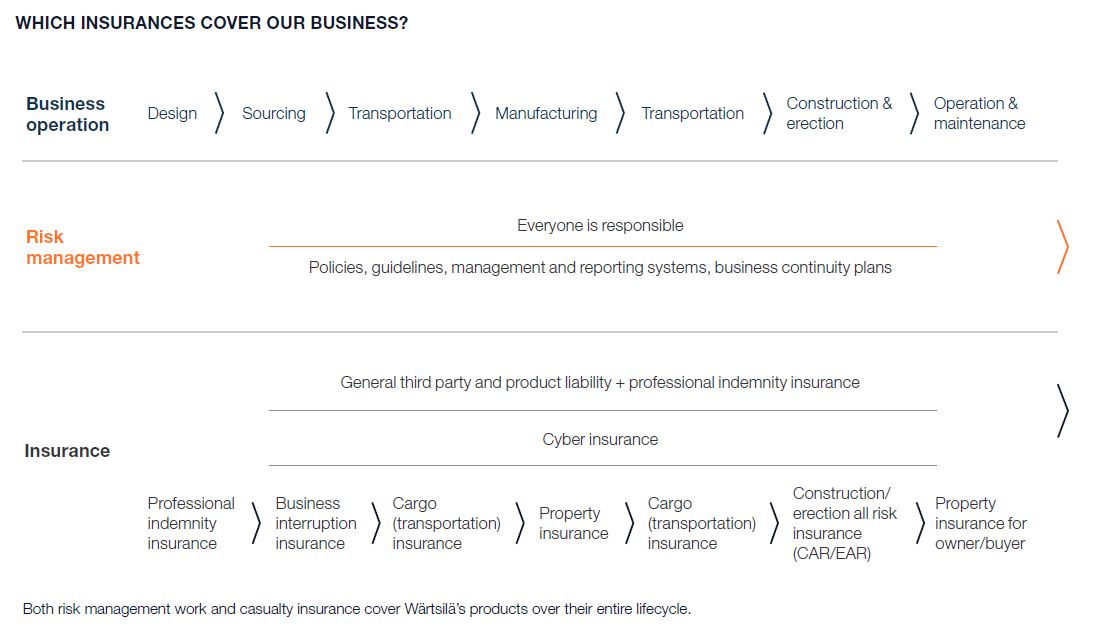 Wärtsilä uses appropriate insurance policies to cover indemnity risks related to its personnel, assets, and business interruptions, including supplier triggered interruptions, as well as third-party and product liability. Wärtsilä has its own captive insurance company, Vulcan Insurance PCC Ltd for insuring Wärtsilä’s own risks. For re-insuring purposes, the company is located on the island of Guernsey. Vulcan Insurance PCC Ltd’s results are consolidated into the corporation’s books and are subject to normal taxation in Finland.