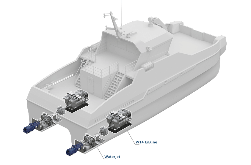 Crew transfer vessels (CTVs) are typically aluminium catamarans for 12 passengers, although they can also be larger and this is becoming increasingly common as wind farms are located further from the coast. Approximately 25% of CTVs use waterjets, 25% fixed pitch propellers, and the remainder use controllable pitch propellers as their main form of propulsion. Engines are highly loaded most of the time as vessels run at 15–20 knt transit speed or higher, taking crew where they need to go as quickly and efficiently as possible.