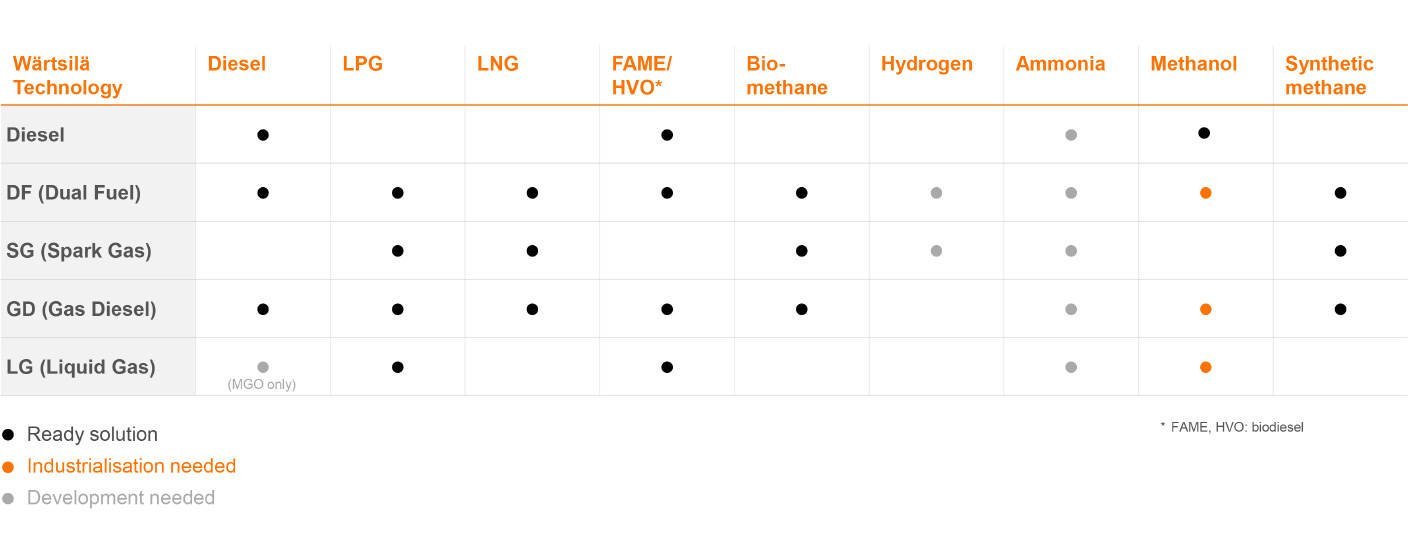 Wärtsilä is investing in all the new fuels and developing flexible technologies for the benefit of the maritime industry. The company’s research on future fuels technology draws on its decades-long experience in building engines and supply and storage systems. This table summarises the existing fuel technologies and the ones under development.