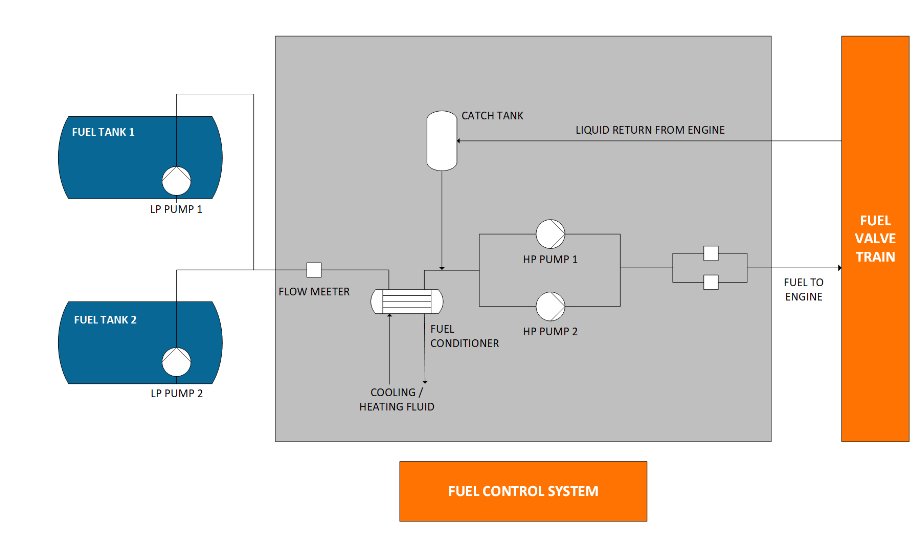 The system is configured with LPG storage tank(s) optimized for the trade of the vessel. The LPG fuel tank(s) is loaded through dedicated bunkering lines, or in case of a LPG carrier reloaded from the cargo tanks. From the fuel tank(s), the LPG is conditioned and prepared as fuel. A system consisting of pumps and heat exchanger is used to supply the engine with a stable and reliable fuel flow, at the correct pressure and temperature. The LPG Fuel Supply System is equipped with proven components, including the necessary return gas conditioning system. Due to need for high cleanness on the fuel there are installed proper filtering upstream and embedded in the system.