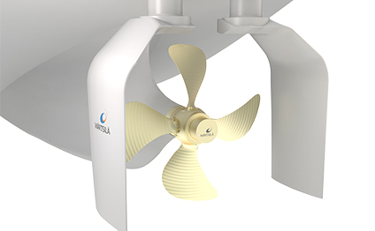 GATE RUDDER™ by Wärtsilä reduces a vessel’s fuel consumption by replacing the drag of a traditional rudder system with a thrust-enhanced arrangement. The arrangement also provides excellent manoeuvring capabilities and improves the noise and vibration signature. Placing the high-lift rudder foils on either side of the propeller enables turning at higher speeds and faster course changes.
