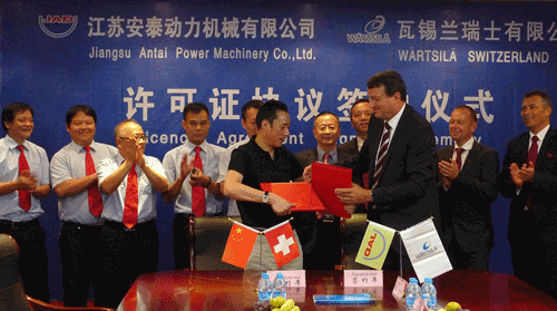 A licence agreement covering the manufacture and sales of Wärtsilä 2-stroke engines has been signed between Wärtsilä Switzerland Ltd and China based Jiangsu Antai Power Machinery Co. Ltd. (JAD). JAD is the former large horse-power division of Wuxi Diesel Engine Plant.