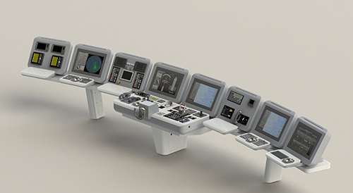 Caption: State-of-the-art navigation consoles are included in the complete bridge system.