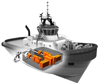 Caption: A typical system arrangement with the Wärtsilä HY for a tugboat application, in diesel-mechanical configuration with shaft motor/generator.