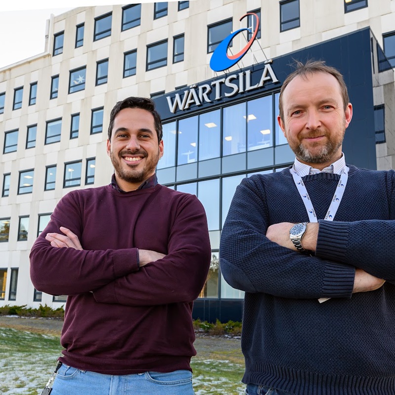Bildetekst: Bjørnar Skogseth, utviklingssjef for elektrifisering i Wärtsilä Ship Electrification Systems,og Francisco Lima, prosjektleder, i Wärtsilä Ship Electrification Systems, jubler for ny kontrakt som tar Wärtsilä på Heiane inn i det amerikanske markedet for hurtigbåter med nullutslipp