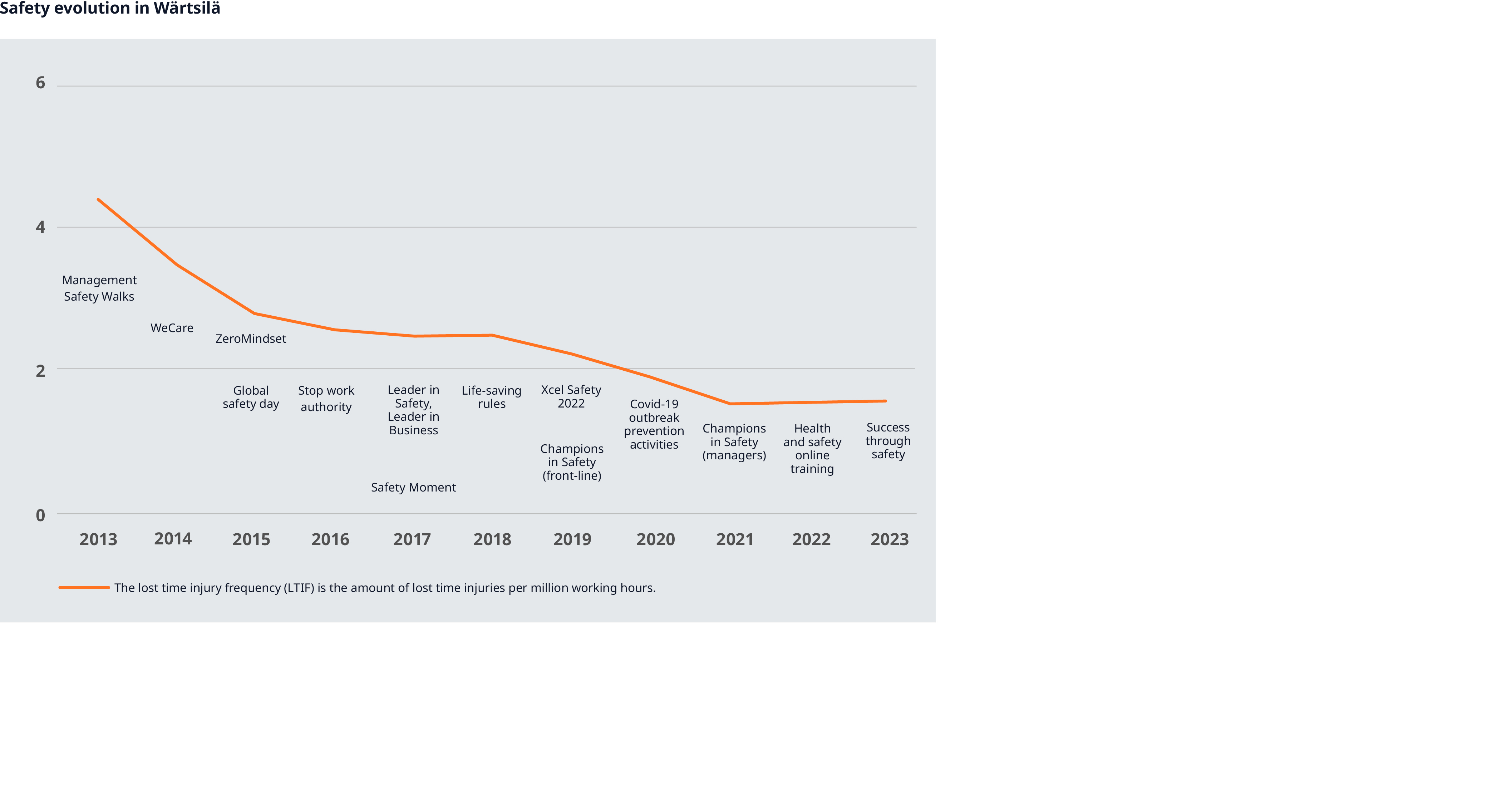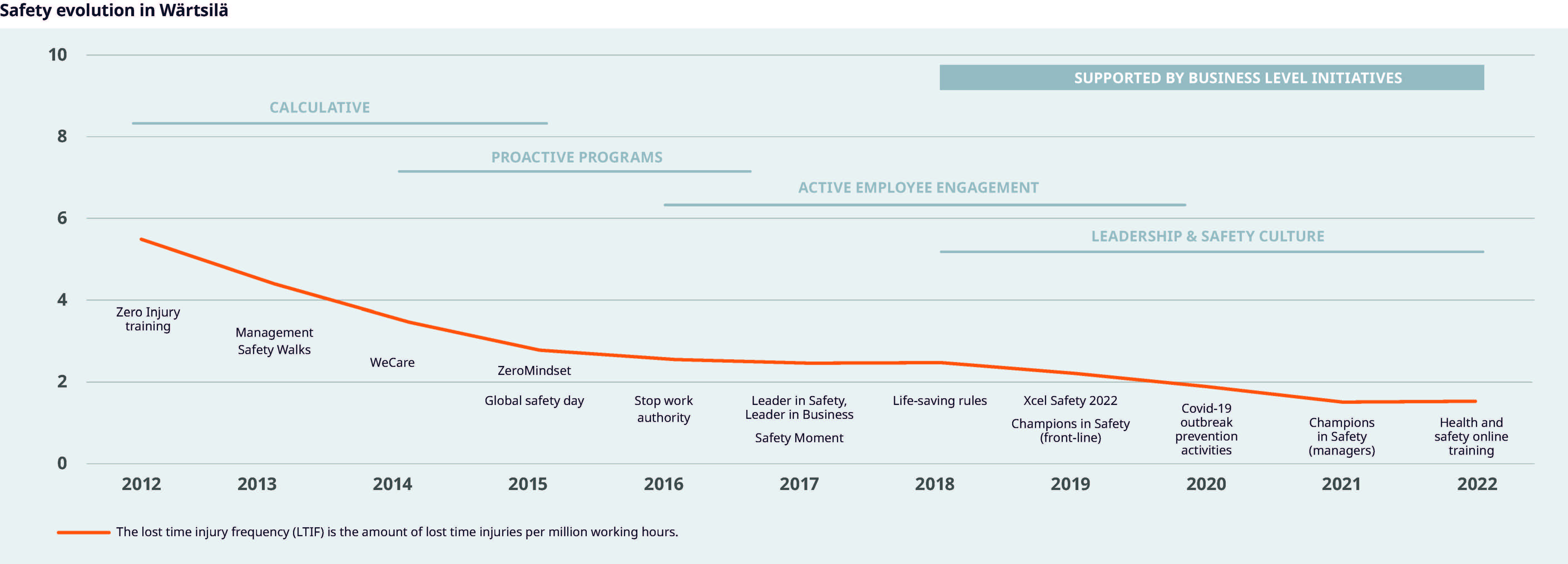 Safety is a high priority for Wärtsilä, and we are committed to creating and maintaining a safe and healthy workplace for our employees and partners, wherever we operate. This is emphasised in our drive towards zero injuries by applying high standards of occupational health and safety, and by implementing action-orientated safety programmes and practices.