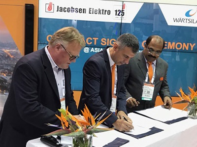 Caption: The agreement was signed by Mr Kjell Rudnäs, Area Sales Director, Jacobsen Elektro and Mr Frederic Carron, Regional Director, South East Asia & Australia, Wärtsilä Energy Solutions.